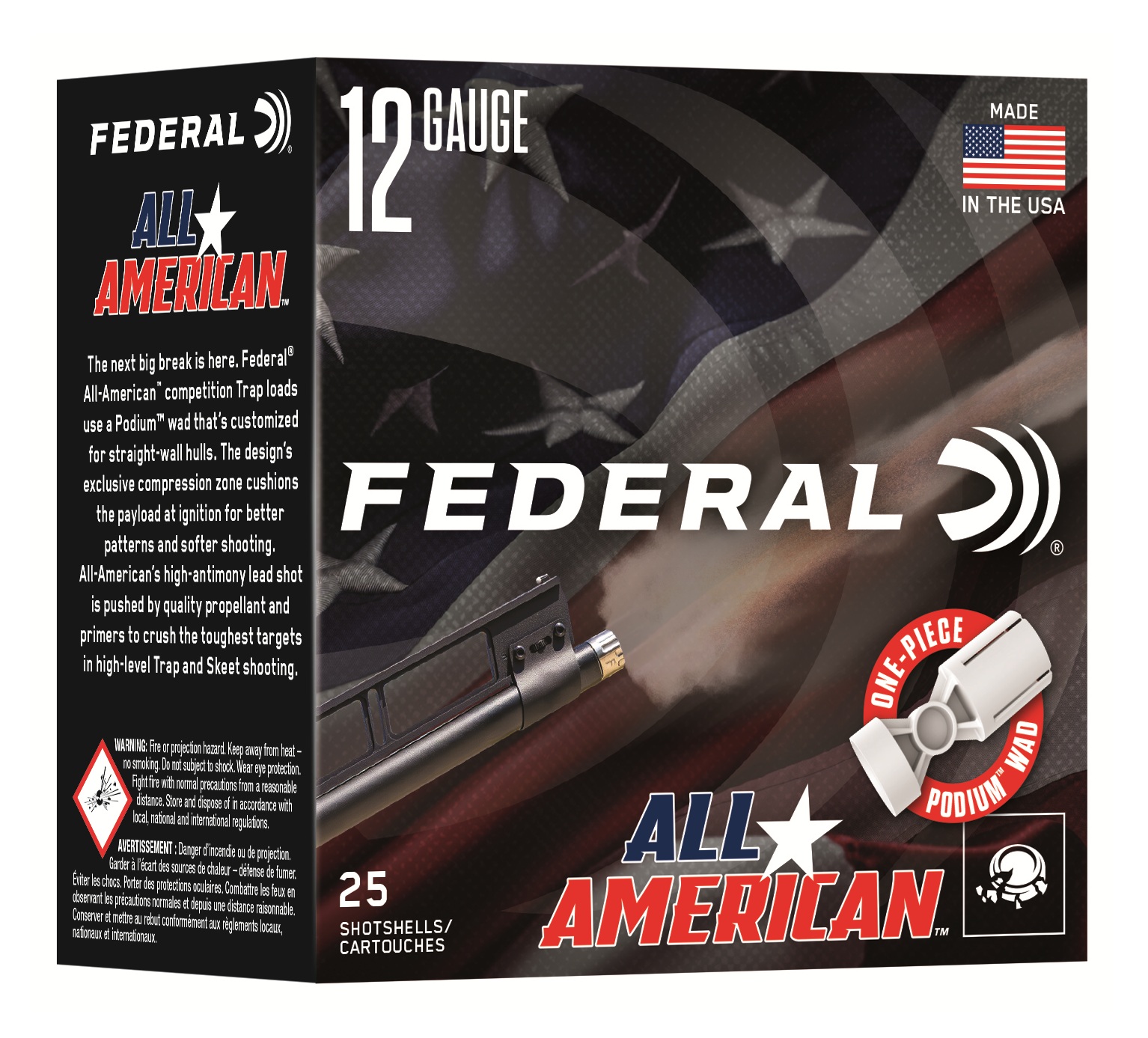 ANOKA, Minnesota - January 14, 2026 - Federal Ammunition expands its all-new shotshell product line: Federal All-American. These competition-level trap and skeet loads feature a customized Podium wad that extracts peak performance from utilizing Federal’s straight-wall hull, reliable primers, high-antimony lead shot, and select propellant. The thirteen competition load options include eleven 2-3/4-inch, 12-gauge loads ranging from 1 ounce to 1-1/8 ounce in 7.5, 8, or 9 shot. And the two 2-3/4-inch, 20-gauge loads are 7/8-ounce in 7.5 or 8 shot.